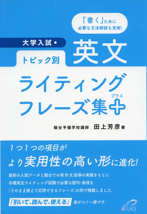 著者は 田上 芳彦 氏。最新の入試データと英作文指導の実績を元に、各「トピック別」で“すぐ使える英文ライティングフレーズ”を集めています。
