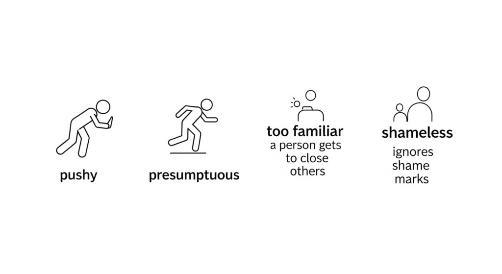 など、日本語の「図々しい」は”行動の境界を越えてくる不快さ”をさすことが多いです。